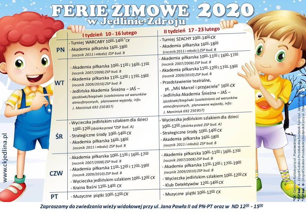 Zapraszamy do zapoznania się z ofertą FERII ZIMOWYCH 2020 w Jedlinie–Zdroju.