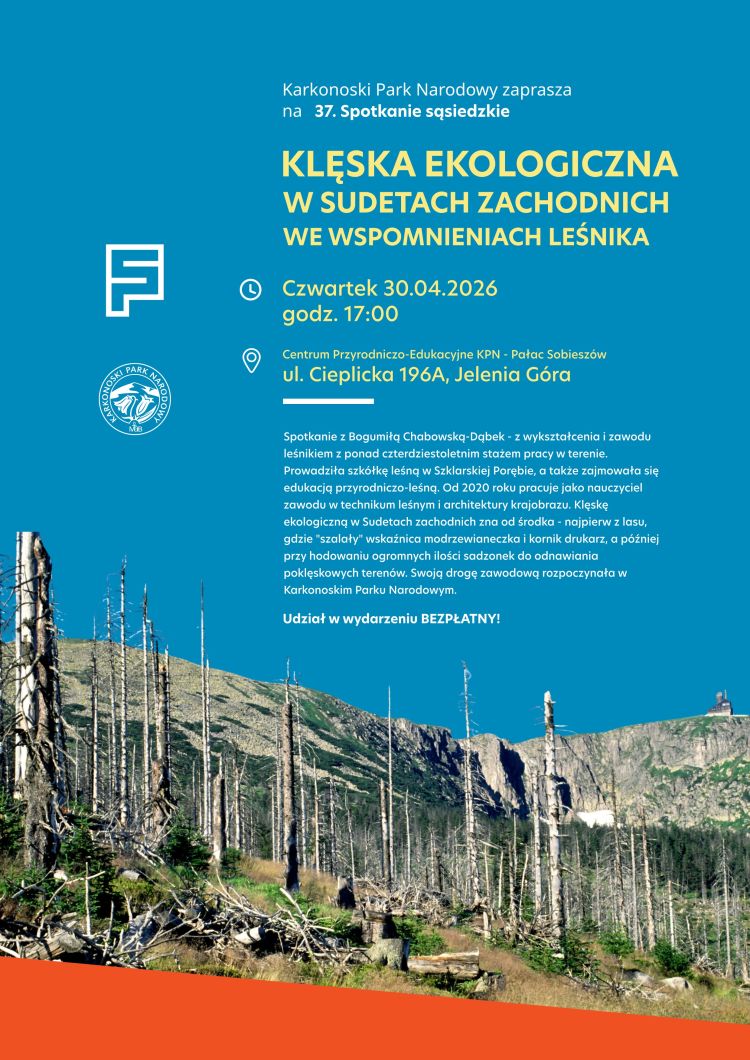 Karkonoski Park Narodowy zaprasza na 37. Spotkanie Sąsiedzkie pt. „Klęska ekologiczna w Sudetach Zachodnich we wspomnieniach leśnika”. Wydarzenie odbędzie się 30 kwietnia 2026 r. o godz. 17:00 w Centrum Przyrodniczo-Edukacyjnym KPN – Pałacu Sobieszów w Jelenia Góra.