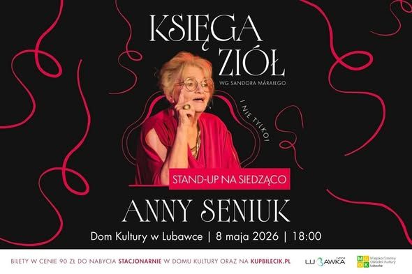 Mamy zaszczyt zaprosić Was na monodram „Księga ziół" – spektakl, który Anna Seniuk nazywa „stand-upem na siedząco". To pełna humoru, autoironii i życiowej mądrości opowieść o sześćdziesięciu latach na scenie, o miłości, sztuce i tym, co najważniejsze. ✨ Inspirowany twórczością Sándora Máraiego i poezją Herberta, Różewicza czy Szymborskiej – w wykonaniu jednej z największych ikon polskiego teatru.