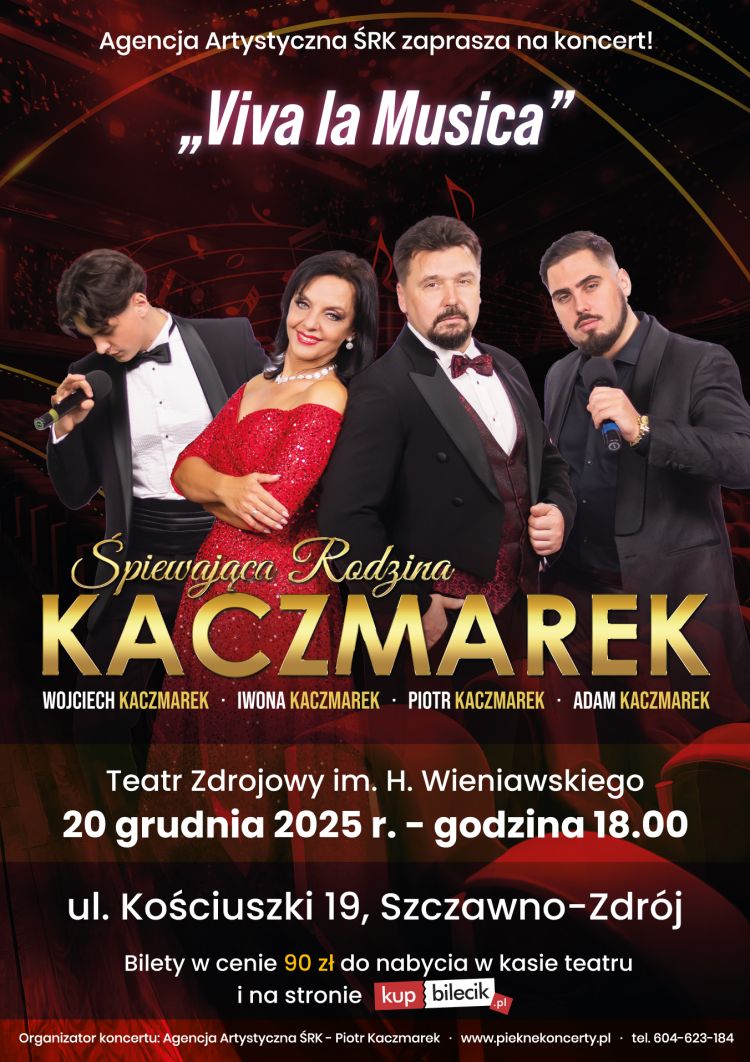 "Viva La Musica" to zupełnie nowy koncert jedynej w Polsce rodziny śpiewającej muzykę klasyczną. W wykonaniu Śpiewającej Rodziny Kaczmarek usłyszycie państwo tym razem najpiękniejsze melodie z operetki min. Wesołej wdówki, Hrabiny Marizy, Księżniczki Czardasza, czy Guditty, przeboje z musicali min: Skrzypka na dachu, My fair lady czy Upiora w operze, a także piękne standardy muzyki rozrywkowej, piosenki z repertuaru Franka Sinatry Elvisa Presleya, Poula Anki czy Luisa Armstronga. Iwona (sopran), Piotr (tenor), Adam (baryton) i Wojciech (baryton) przeniosą Państwa w cudowny świat muzyki, gdzie czekają na was niesamowite doznania emocjonalne. Piękna muzyka i wspaniałe głosy sprawią ,że będzie to niezapomniany wieczór. Zapraszamy!