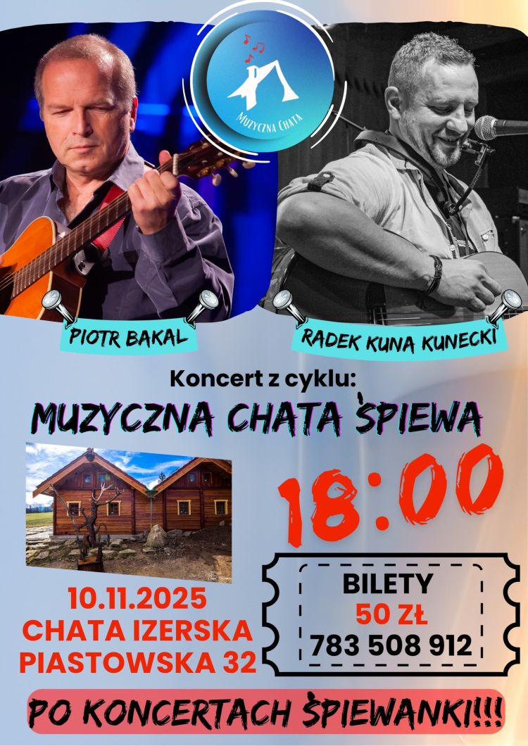 W jesienny wieczór do Chaty Izerskiej zawitają Piotr Bakal – legenda polskiej piosenki autorskiej – oraz Radosław Kunecki (Kuna), poeta, kompozytor i gospodarz cyklu Muzyczna Chata Śpiewa.