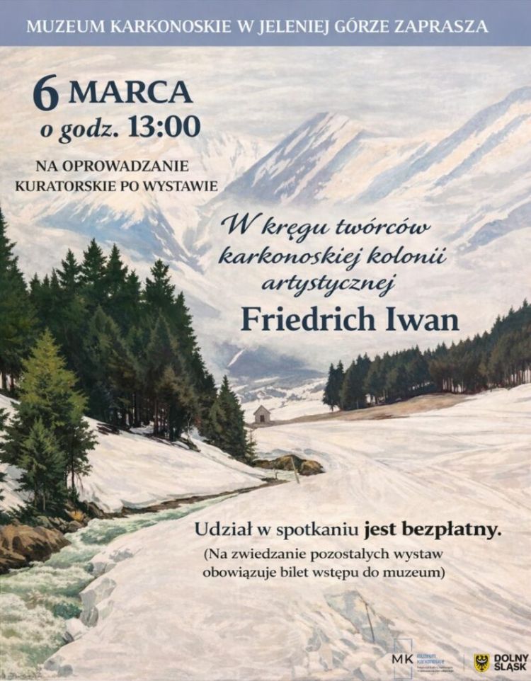 Muzeum Karkonoskie w Jeleniej Górze z przyjemnością zaprasza 6 marca 2026 o godz. 13:00 na bezpłatne oprowadzanie kuratorskie po najnowszej wystawie czasowej „W kręgu twórców karkonoskiej kolonii artystycznej. Friedrich Iwan”.