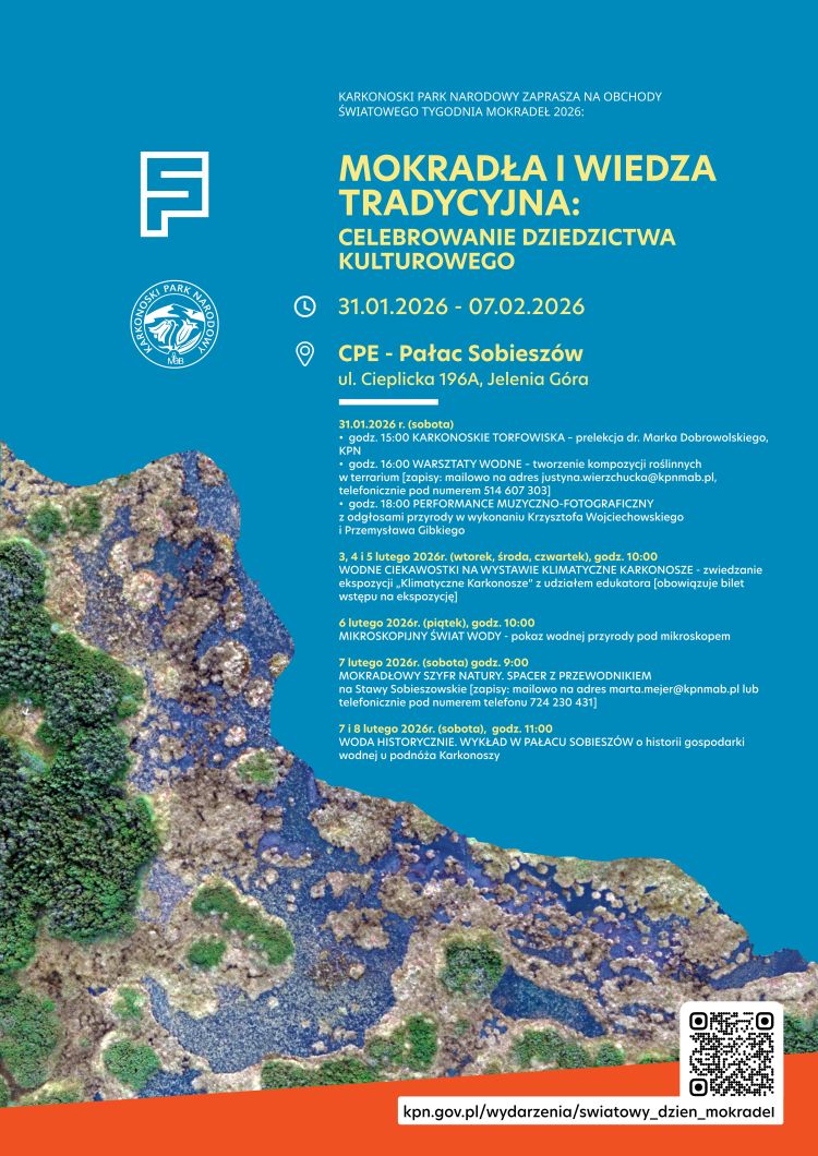 Zwiedzanie ekspozycji „Klimatyczne Karkonosze” z udziałem edukatora o znaczeniu mokradeł jako jednych z najcenniejszych ekosystemów Karkonoszy, pełniących ważną rolę w retencji wody, ochronie bioróżnorodności oraz łagodzeniu skutków zmian klimatu. Udział w wydarzeniu wymaga zakupu biletu wstępu na wystawę.
