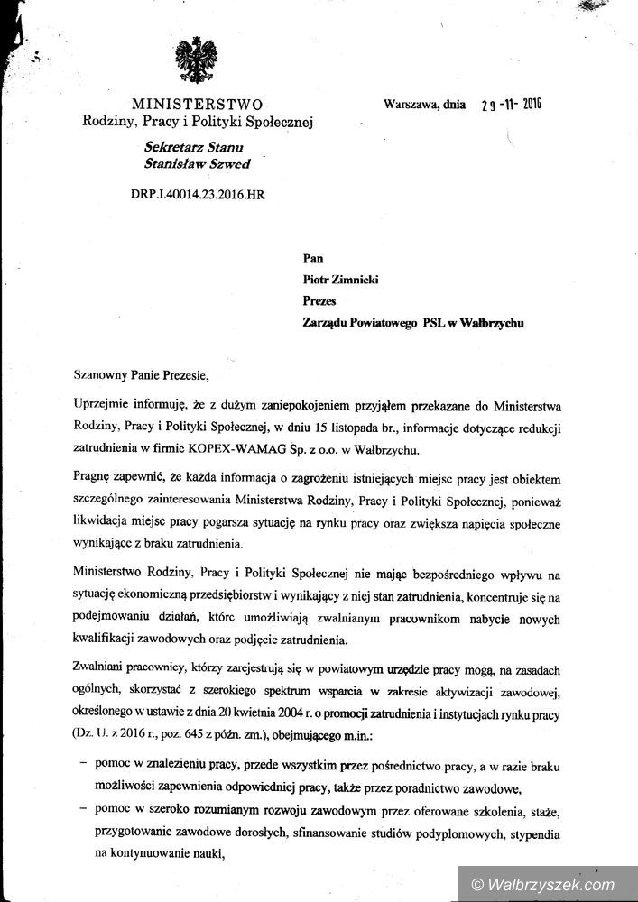 Ministerstwo Rodziny, Pracy i Polityki Społecznej odnosi się do sprawy zwolnień w WAMAG–u