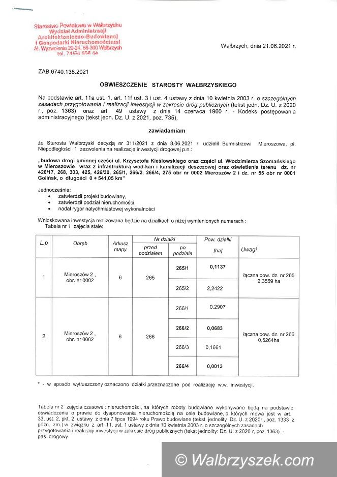 Obwieszczenie Starosty Wałbrzyskiego, że decyzją nr 311/2021 z dnia 8.06.2021 r. Starostwa Wałbrzyski udzielił Burmistrzowi Mieroszowa, pl. Niepodległości 1, zezwolenia na realizację inwestycji drogowej.