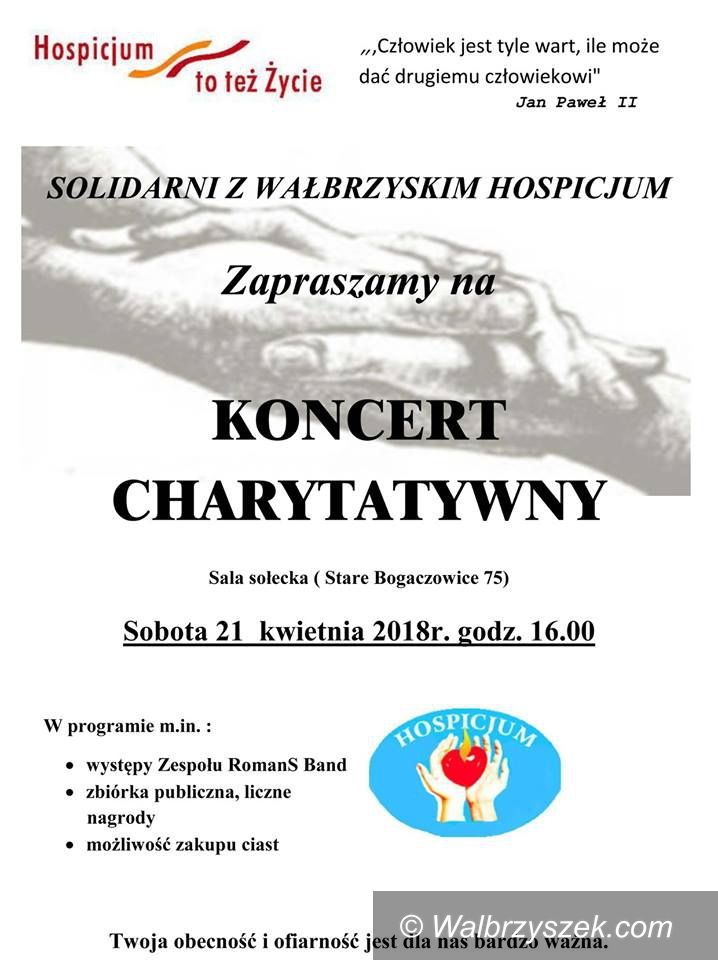Społeczny Komitet „Solidarni z Wałbrzyskim Hospicjum” przy Gminnym Ośrodku Pomocy Społecznej w Starych Bogaczowicach w ramach pozwolenia na zbiórkę publiczną o nazwie “Wspomóż Hospicjum” organizują kolejny Koncert Charytatywny na rzecz Polskiego Towarzystwa Opieki Paliatywnej Oddział w Wałbrzychu.