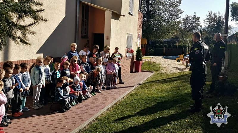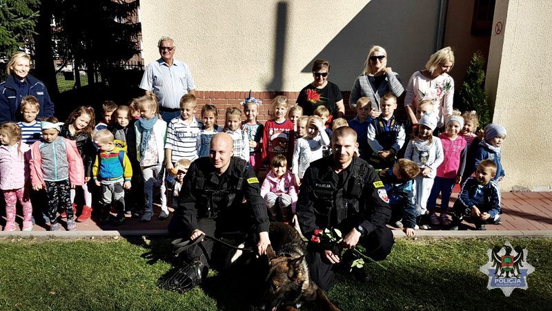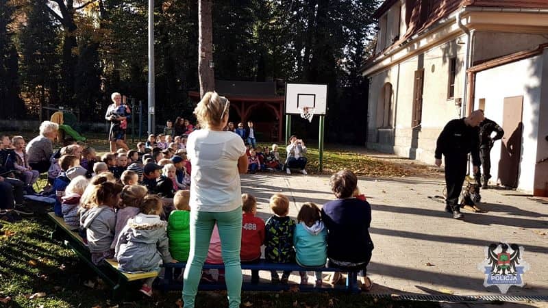 Policjanci rozmawiają z dziećmi o właściwym zachowaniu w stosunku do obcych zwierząt