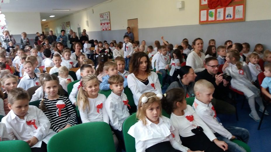 Dzieci stworzyły żywy Łańcuch Serc dla Niepodległej, którym otoczyły szkołę (klasy młodsze budynek przy ul. Dunikowskiego, klasy starsze budynek przy ul. Głównej). Następnie ustawiły się w kształcie wielkiego biało-czerwonego serca. Odbył się także okazjonalny apel, na którym uczniowie klas pierwszych zatańczyli poloneza i wykonali Taniec z Flagami dla Niepodległej. Uroczystość zakończyła się wspólnym odśpiewaniem czterech zwrotek Mazurka Dąbrowskiego, w którym wspomogli nas rodzice i dziadkowie naszych uczniów. Cała społeczność szkolna i goście z dumą prezentowali na swych piersiach wykonane przez uczniów kokardy narodowe.